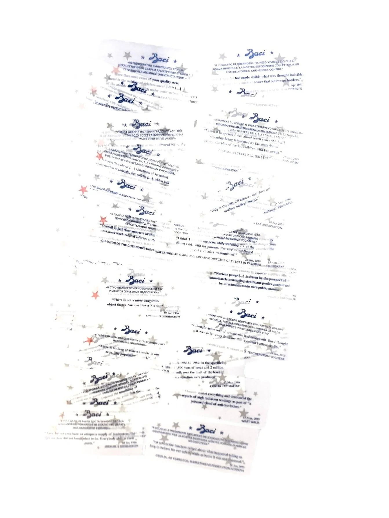 By replacing the original notes with fragments of suppressed fallout data, declassified state secrets, and institutional cynicism, the chocolates are transformed into carriers of radioactive memory. This gesture turns a nostalgic object of affection into a subversive, anti-colonial vessel, one that leaks historical truths instead of sentimental lines. The Baci become mouth-sized monuments to denial, violence, and systemic failure.
